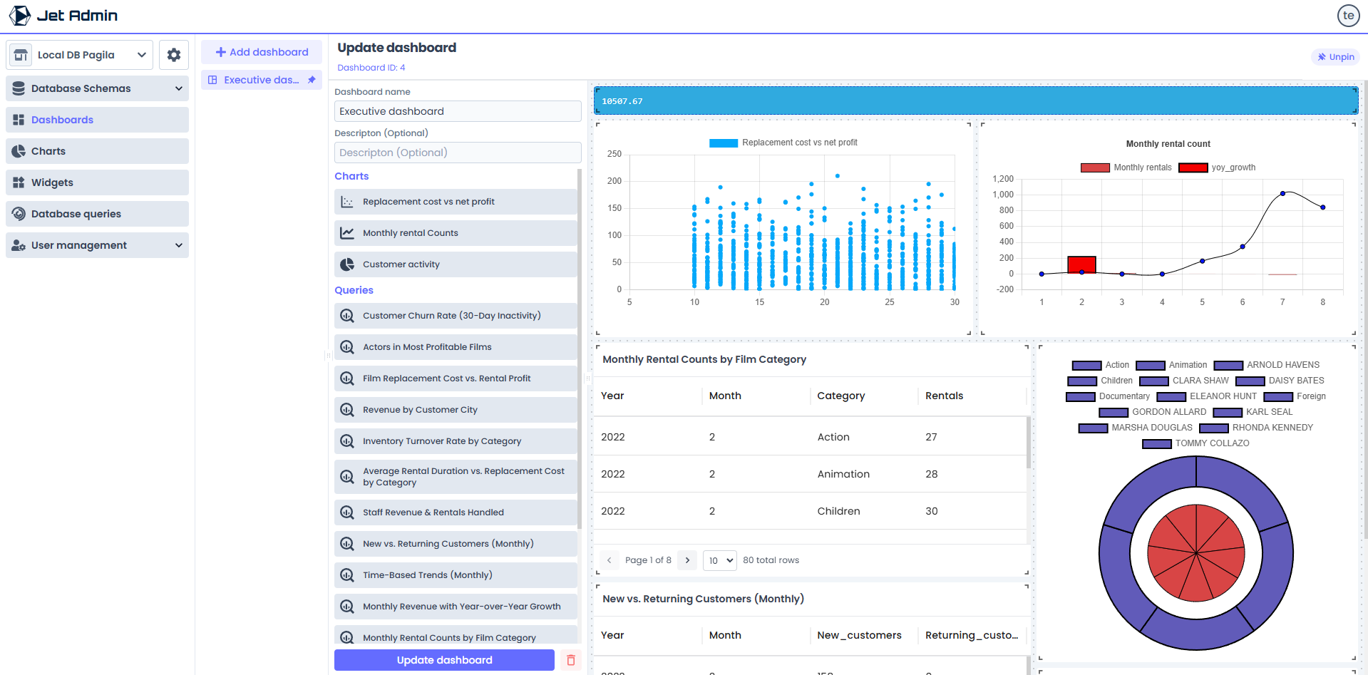 Welcome to Jet Admin, a web-based PostgreSQL tables manager and admin dashboard for your operations! Edit data, build graphs, and create dashboards using queries.